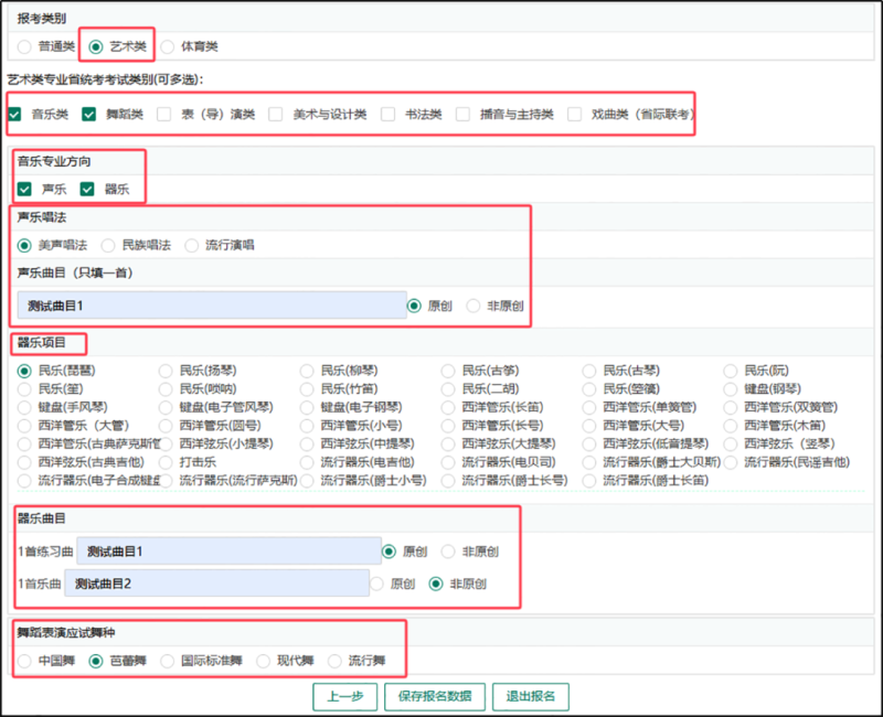 艺术类考生可以根据自己的实际情况,报考类别选择“艺术类”,艺术专业省统考考试类别(可兼报),并根据页面提示完成各类别附加信息的填报,参考界面如下: