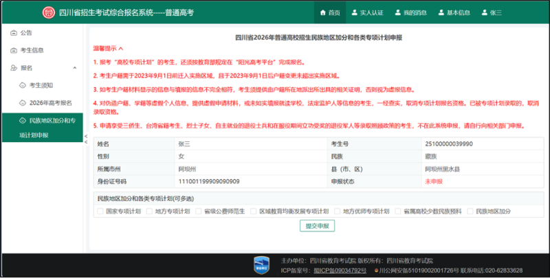 报名成功后,符合民族地区加分、专项计划报考资格的考生,可点击“民族地区加分和专项计划申报”菜单进行主动申报,考生根据实际情况申报即可,如下图: