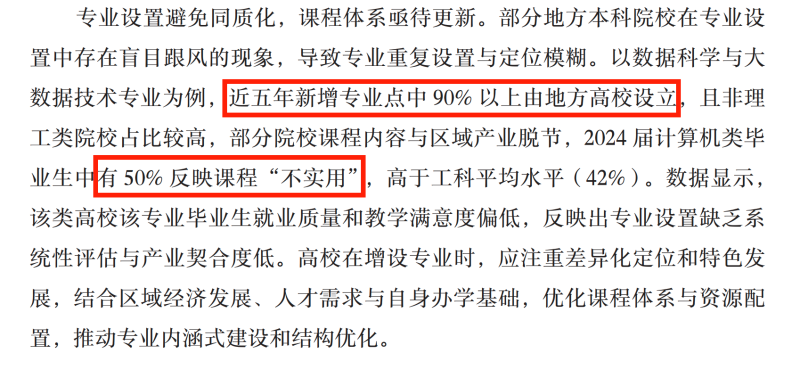 报告指出,部分地方本科院校在专业设置上存在“盲目跟风”现象,同质化严重。不少学校在课程内容、教学资源、师资配备等方面并未跟上产业发展步伐,专业设置缺乏系