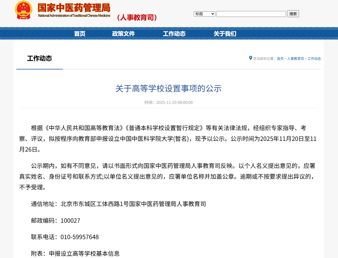 11月20日,国家中医药管理局发布《关于高等学校设置事项的公示》:根据《中华人民共和国高等教育法》《普通本科学校设置暂行规定》等有关法律法规,经组织专家指导、考察、评议,拟按程序向教育部申报设立中国中医科学院大学(暂名),现予以公示。公示时间为2025年11月20日至11月26日。
