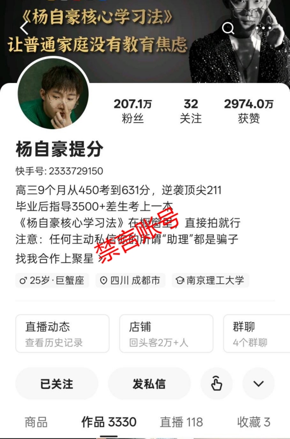 抖音账号“杨自豪提分”、快手账号“杨自豪提分”、小红书账号“杨自豪提分咨询”在教育领域“贩卖”焦虑带货卖课,造成恶劣影响。涉及的账号已依法依约处置。
